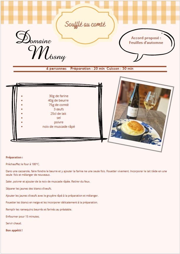 Ce mois-ci, nous mettons à l’honneur une recette aussi élégante que réconfortante : le soufflé au comté. Léger, aérien et délicatement parfumé, il dévoile toute la puissance du comté relevée d’une pointe de muscade. Un véritable plaisir chaud et réconfortant.